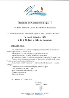 La prochaine séance du Conseil Municipal aura lieu le lundi 9 février 2026 à 20h00 dans la salle du conseil.